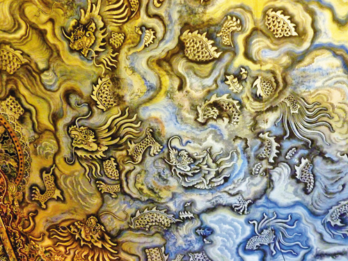 Thứ hai, nghệ thuật độc đáo của tranh tường Huế là thủ pháp đặt và chồng màu trước, sau, đậm, nhạt. .. cuối cùng là chọn màu nền. Đến nay kết quả nghiên cứu về tranh tường Huế chưa đầy đủ, nhưng các nhà nghiên cứu mỹ thuật phải "ngả mũ cúi chào" trước những tinh hoa hội họa đạt đến mức tinh xảo về đường nét, hài hòa về bố cục. Trong lăng Khải Định, tại cung Thiên Định, hiện vẫn còn bức tranh "Cửu long ẩn vân" - 9 con rồng ẩn trong mây do họa sĩ danh tiếng Phan Văn Tánh vẽ.